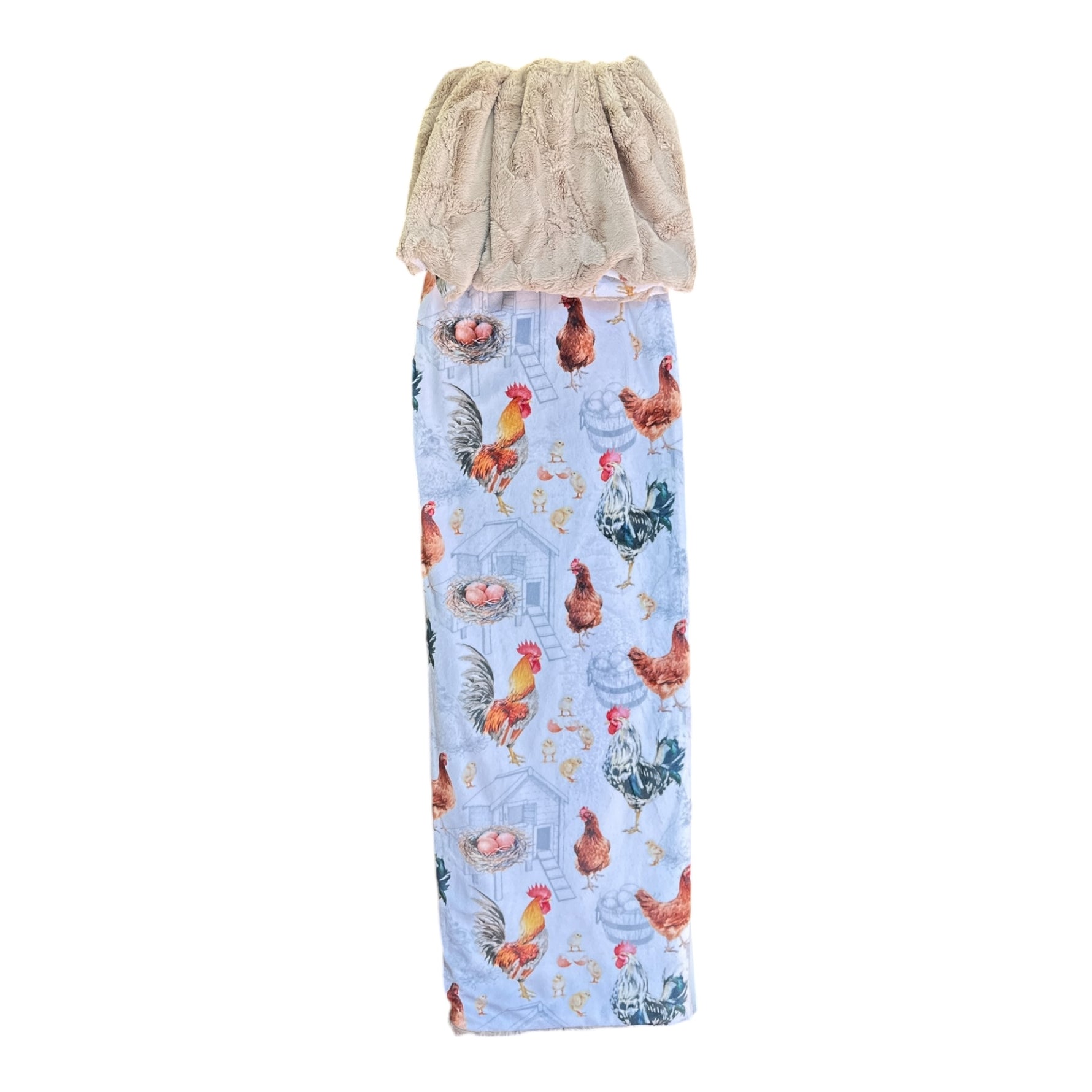 What came first, the chicken or the egg? Either way you'll get a little bit of both on this chicken inspired smooth Minky fabric with three choices on the flipside in the fluffy hide, Minky, fabric, natural, ginger, or golden.