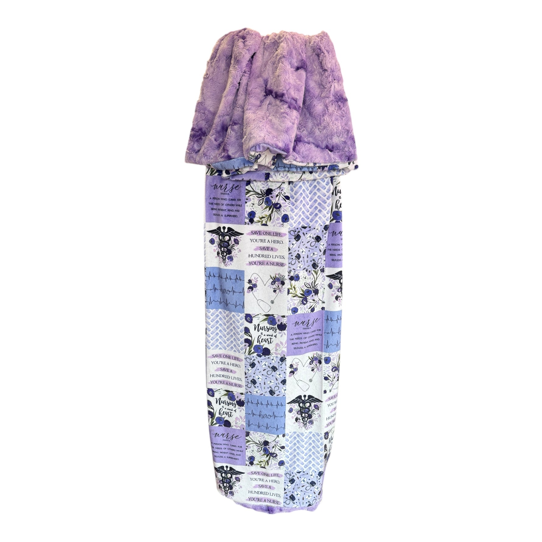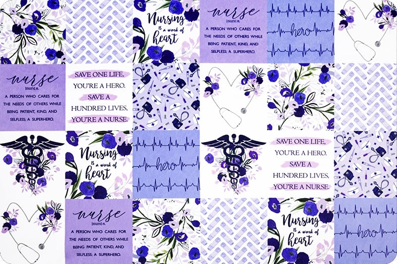 This special edition Nurse Heart blanket was created for the ones who pour into everyone else. Designed with inspirational nursing quotes, heartbeat details, and soothing shades of lavender + soft periwinkle, this fabric celebrates the caregivers, the healers, and the quiet everyday heroes.