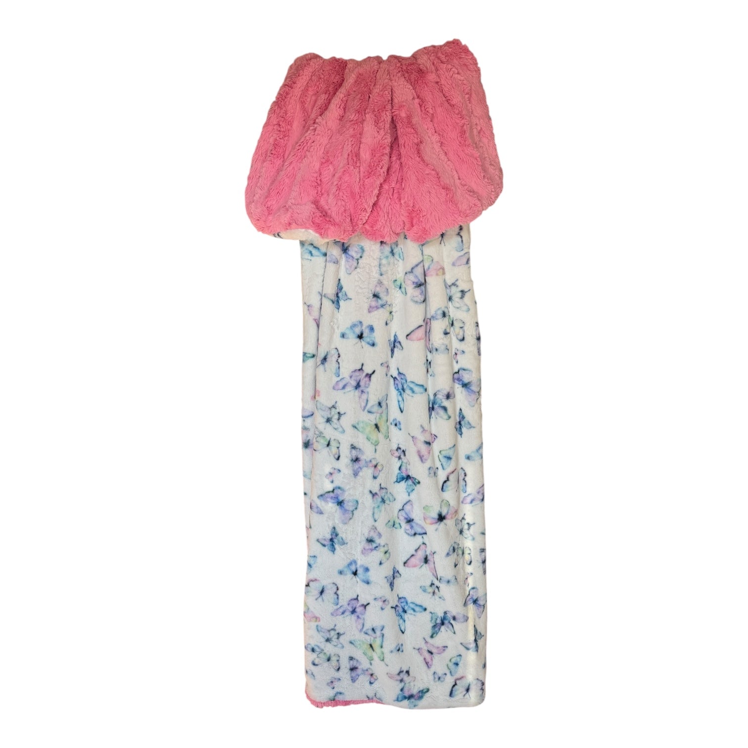 This minky fabric bursts with charming and whimsical butterflies and your choice of three fun fabrics for the flipside.
