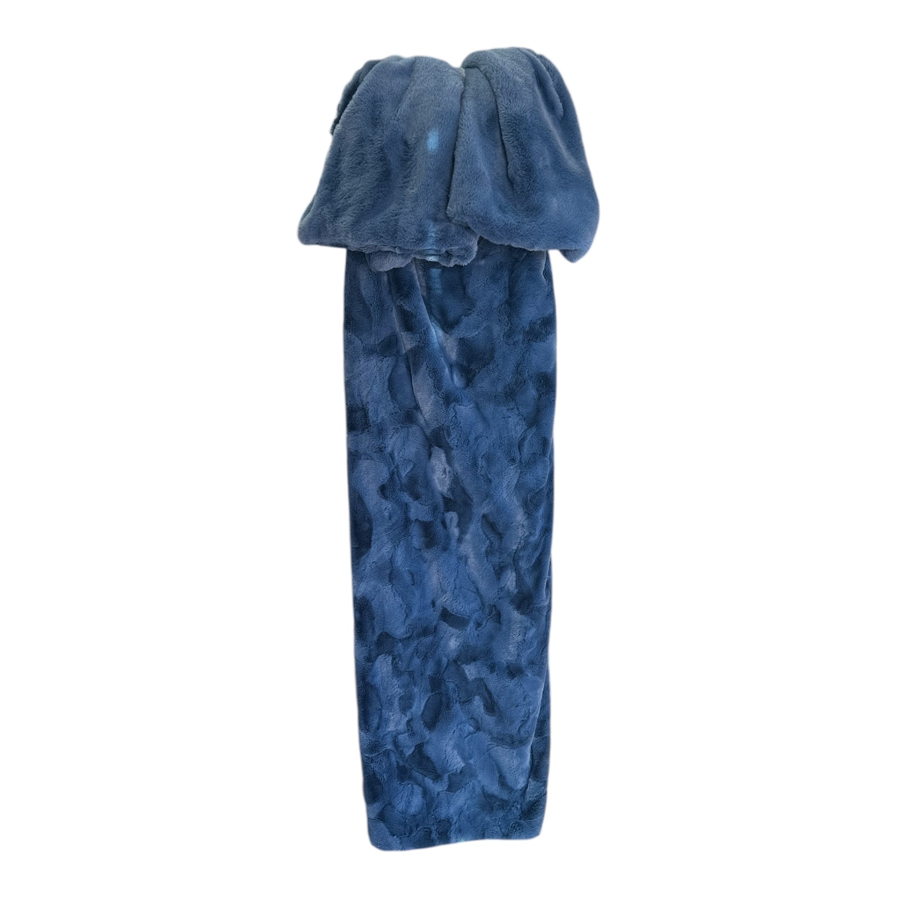 Two beautiful shades of Jean color make for the perfect snuggle blanket. One side is encore Minky fabric. The other side is hide Minky fabric.
