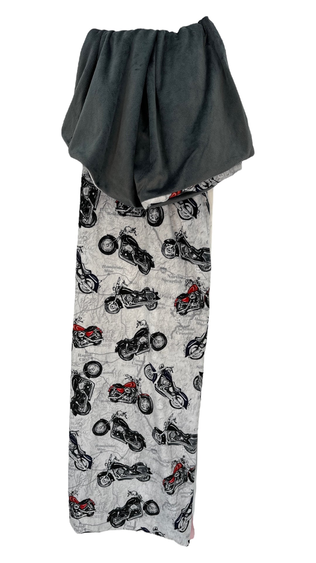 All things motorcycle for the rider in your life that cant ride in the cold but dreaming of the open highway with your choice of smooth gray minky, or iron, caviar or red hide minky fabric on the flipside