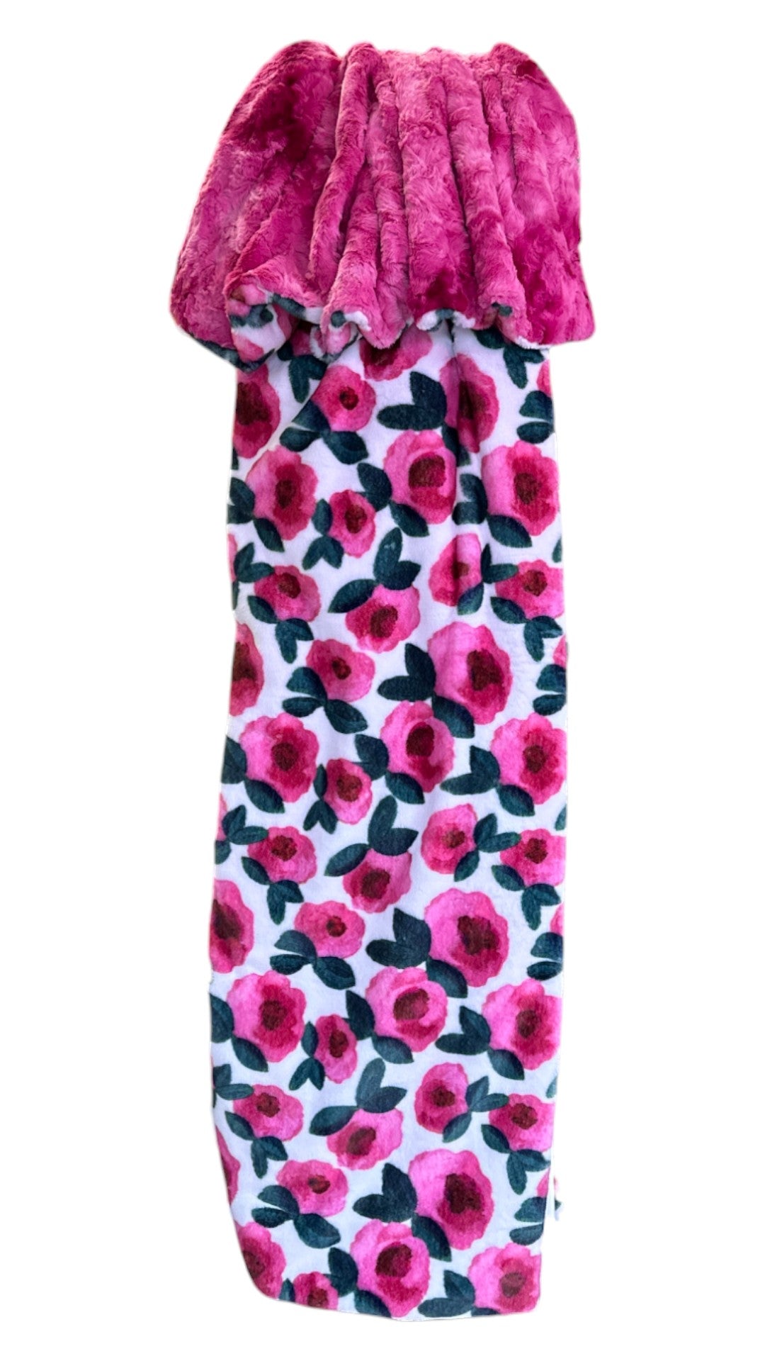 This amazingly soft cuddle seal minky fabric has bright fushia roses and two choices for the flip side in galaxy magenta or Hide spruce both minky fabric.