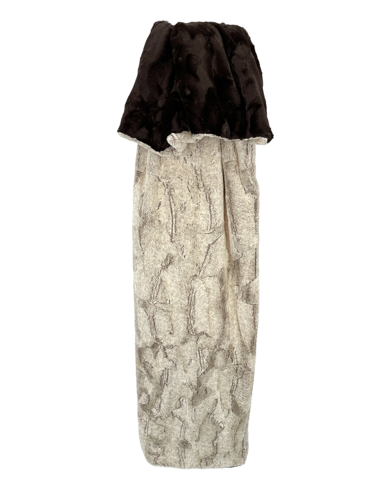 Heather quartz minky fabric in tones of taupe and brown with the flip side choice of either natural or chocolate hide minky fabric