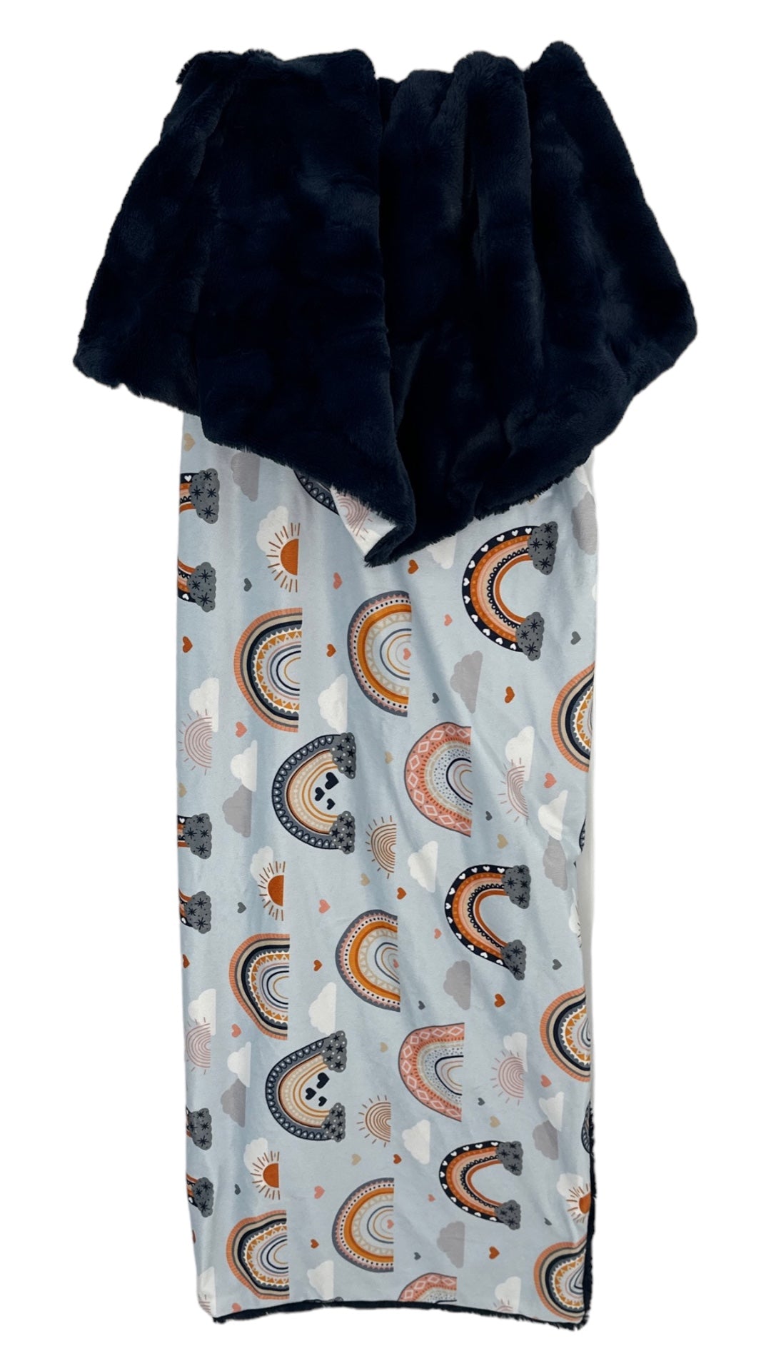 Rainbows in shades of orange, blue and gray on this silky minky fabric with your choice of  graphite or ink fluffy hide minky on flipside