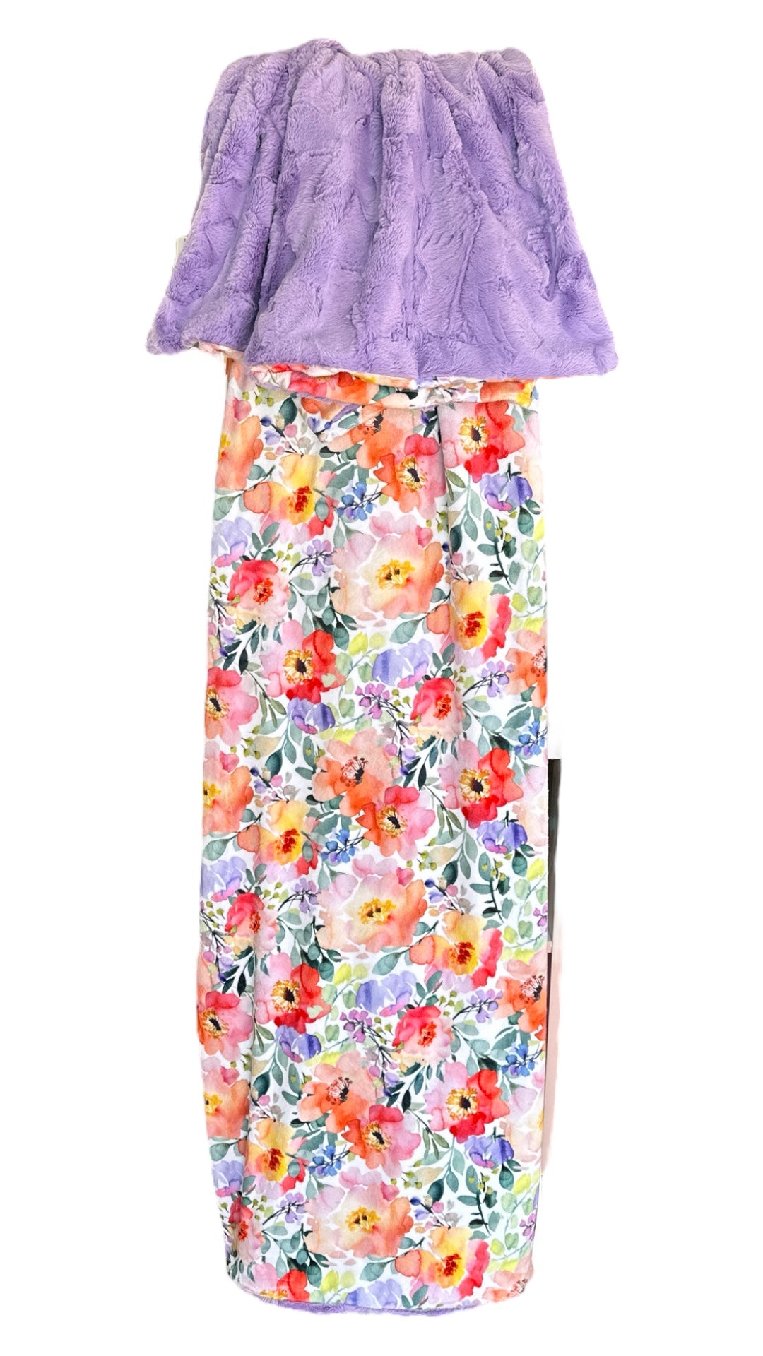 This floral pattern just shouts spring with beautiful flowers on smooth minky fabric and 4 options on the flipside in fluffy minky either Heathered cotton candy, bellflower, or galaxy mallard