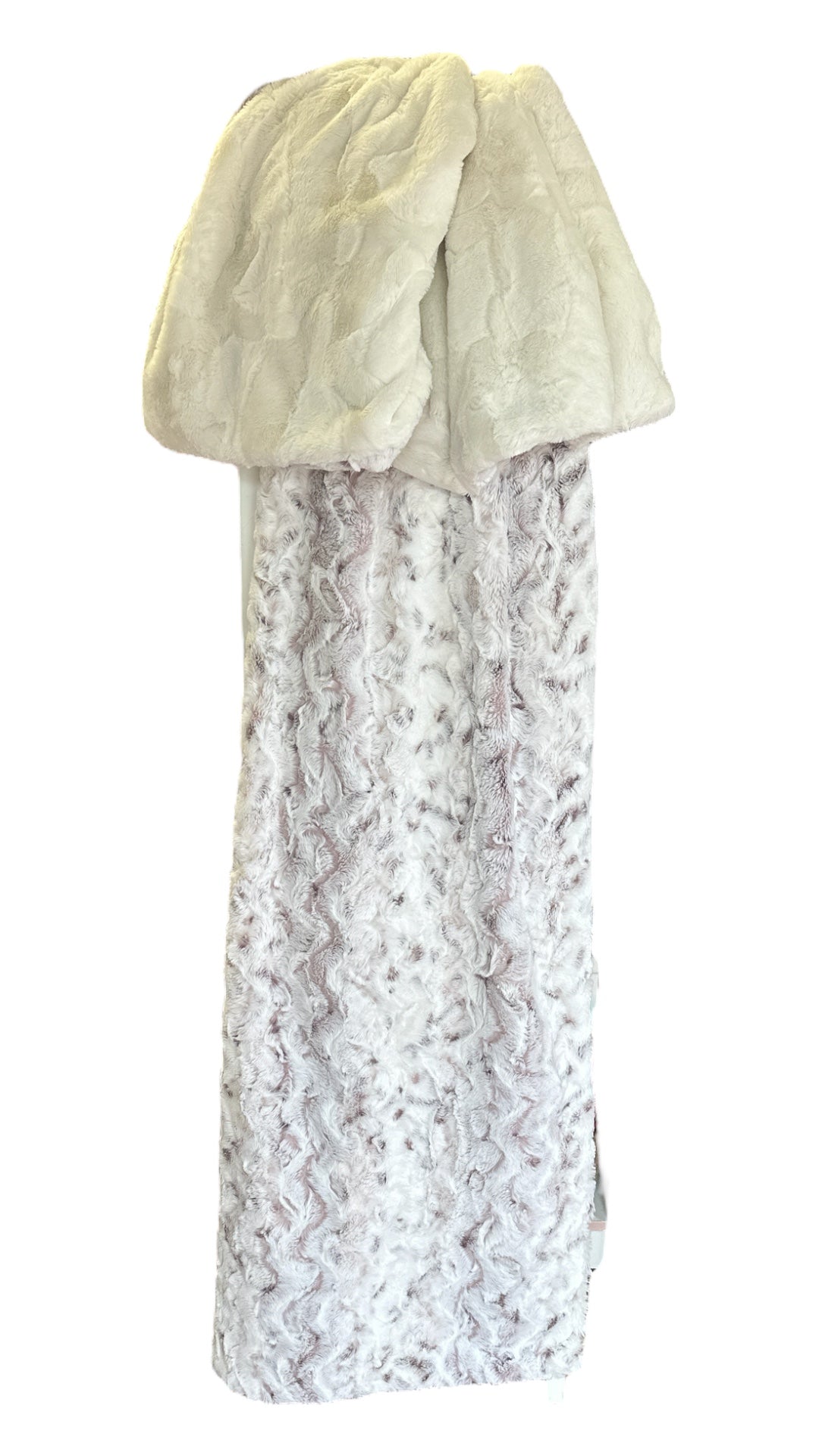 Snowy Owl minky plush fabric features an intricately textured embossed design, inspired by the enchanting snowy owl and its majestic plumage. This luxurious minky captures the ethereal beauty and soft elegance of these magnificent birds. This one is in the beautiful elderberry. With two choices for the flipside, either natural or elderberry, both Minky hide fabric.