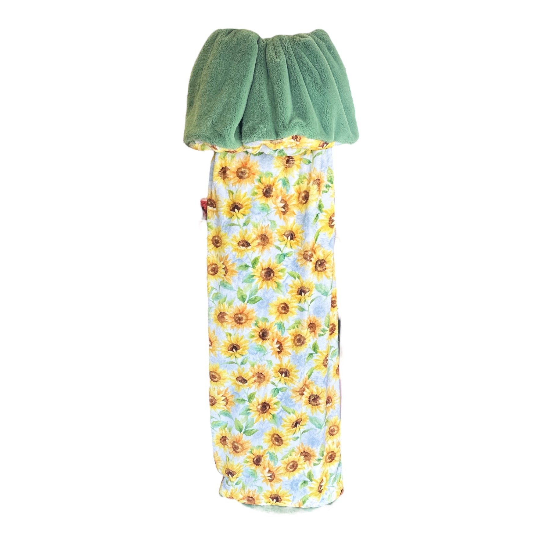This luxurious, blanket features, vibrant sunflower patterns on a soft Minky fabric that's ideal for curling up on chilly days or adding a splash of warm to your home decor. Your choices for backing are green seal minky, or spruce hide minky