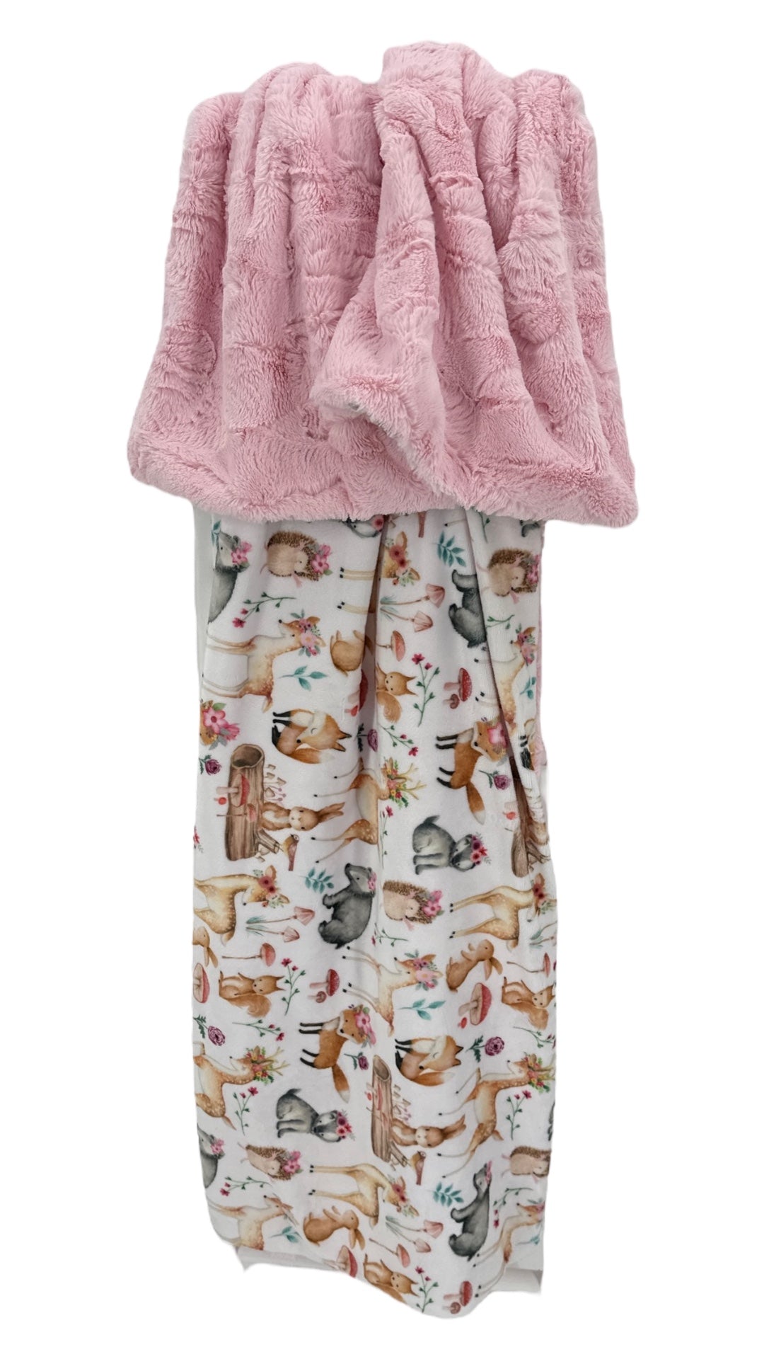 Sweet woodland creatures are on this minky fabric with your choice of fluffy minky backside. Carnation, blush, silver or khaki