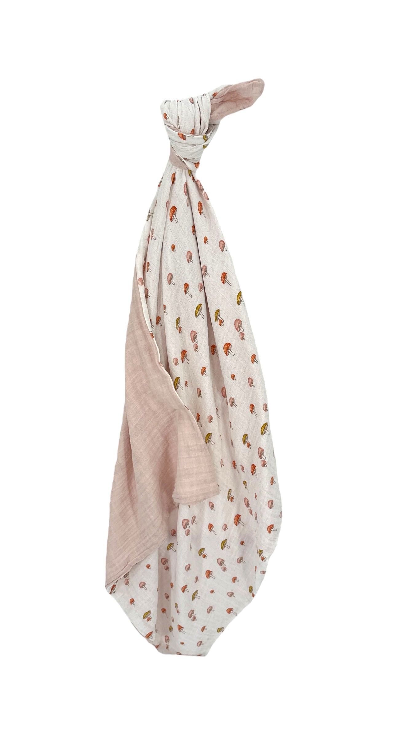 Sweet little individual mushrooms on this gauze fabric with the palest of peach gauzy flips