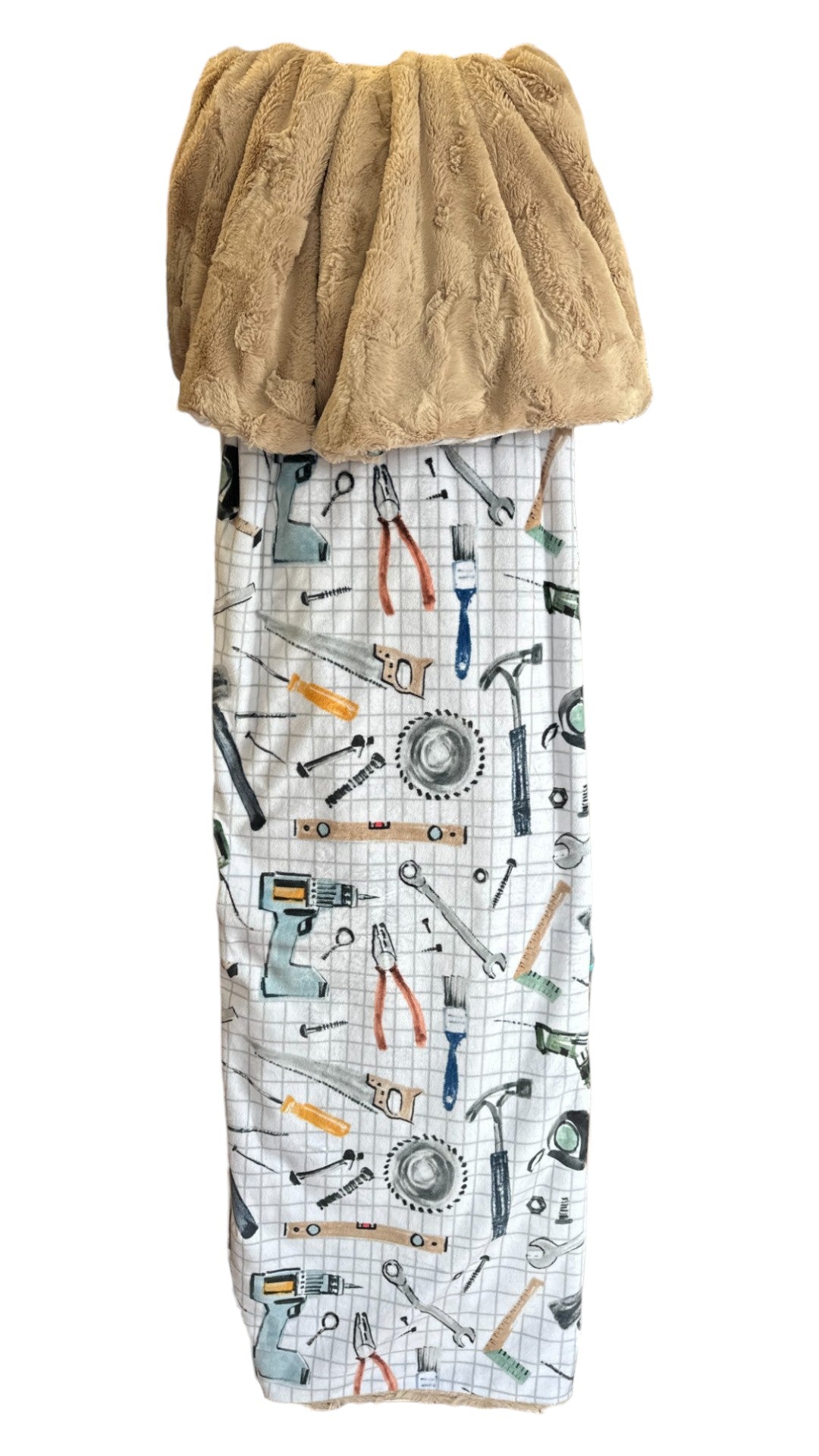 For the person that loves all thing tools this is the blanket for them. The front side is covered in fun tools on a silky Minky fabric, with three choices on the flipside in fluffy Minky hide. You can choose from safari Iron or ginger to complete your blanket.