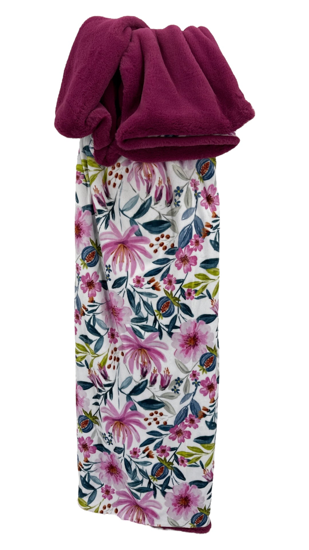 Beautiful tropical flowers in pinks and blue minky fabric with your choice of hide snow, Hide magenta or C3 dark lime .