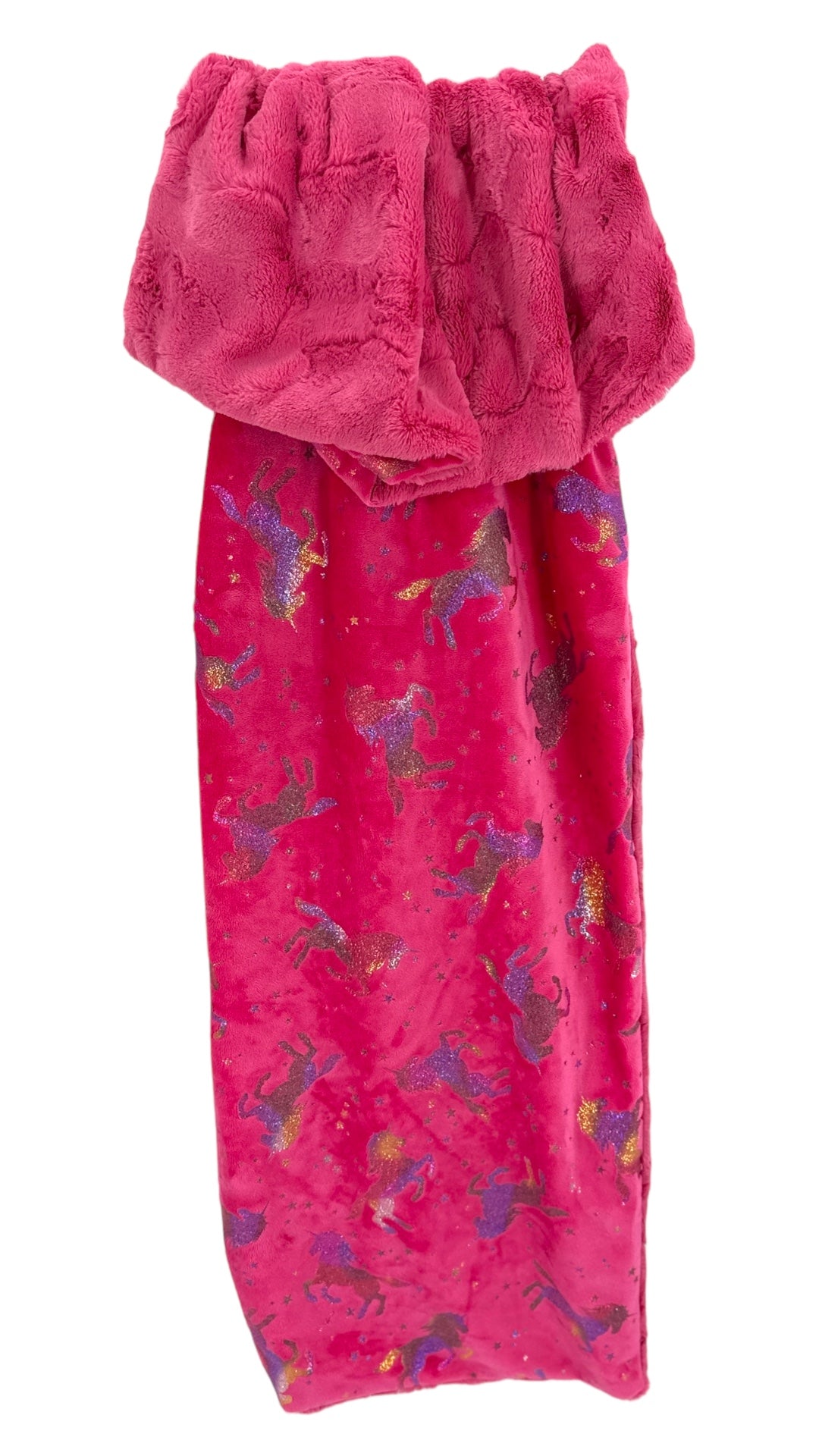 Iridescent unicorns on this bright pink minky fabric with fluffy hide minky in carnation on the flipside.