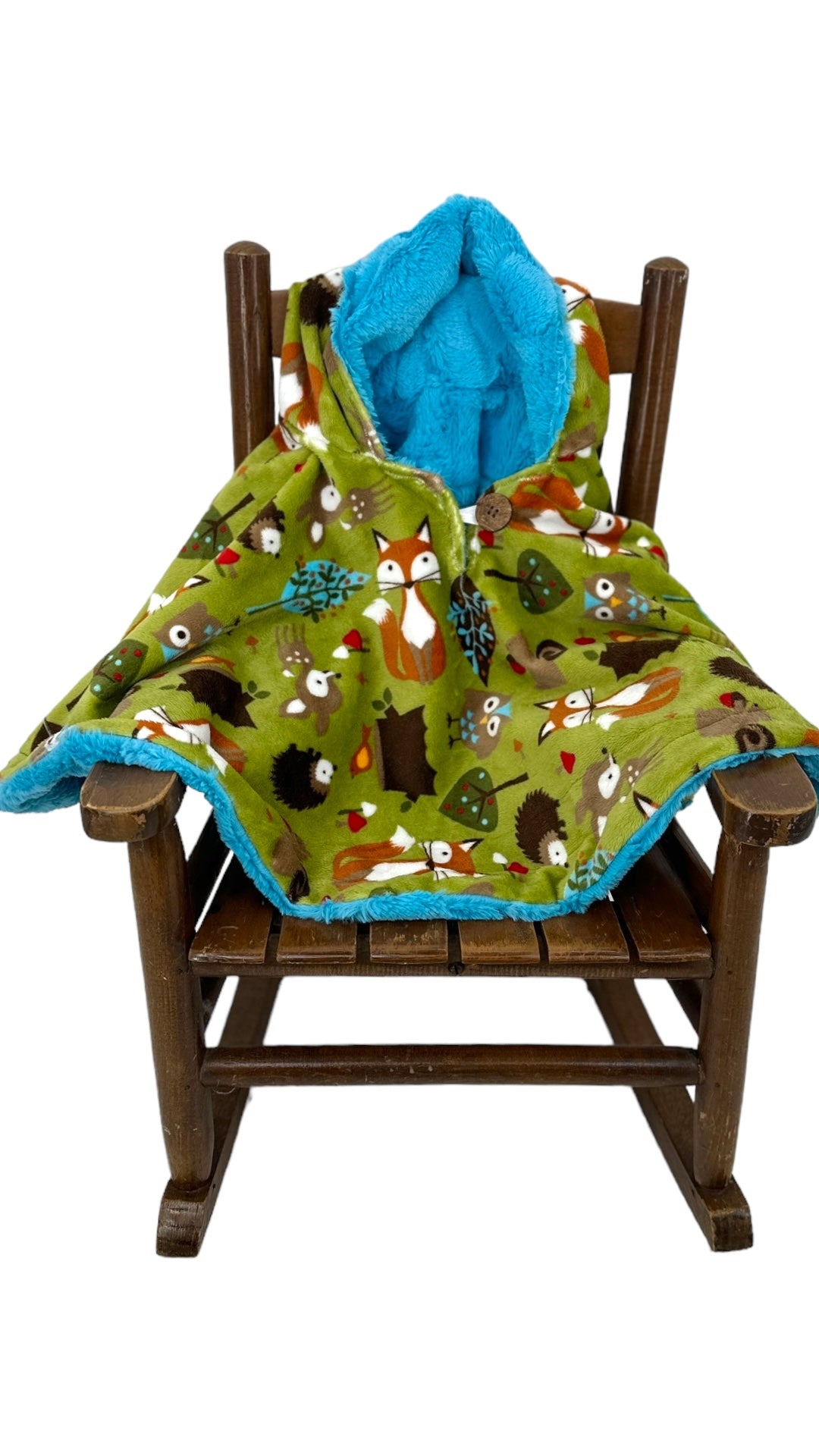 Cute little fox and all his friends are on this smooth minky fabric with your choice of aquarius, ginger or chocolate fluffy hide minky on the underside