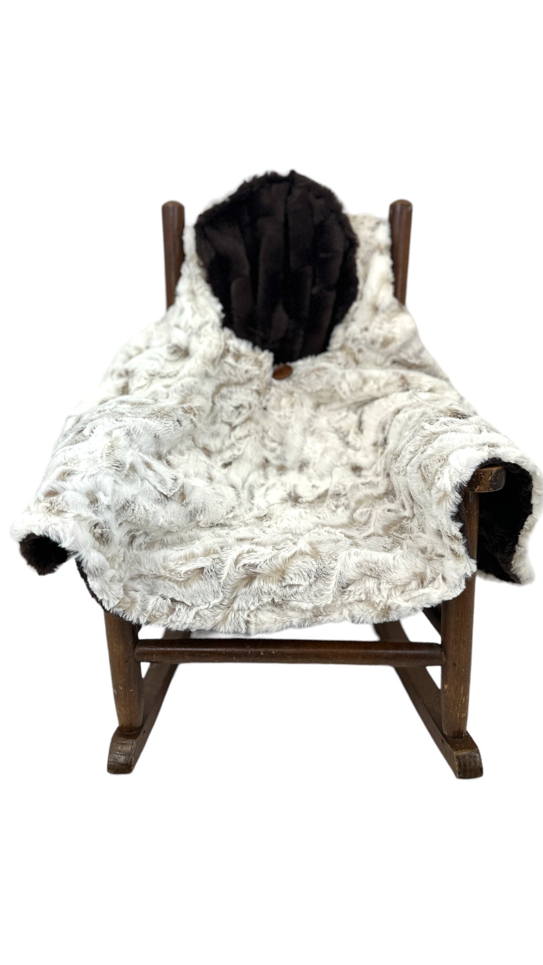 This stunning snowy owl fabric is cream with tones of tan and brown with a choice of chocolate(shown), natural or truffle hide minky fabric on the underside