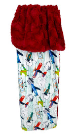 Silky minky fabric with whimsical airplanes floating thru the sky with a choice of 4 different fluffy minky fabrics to match any color scheme. Cardinal, silver, ink or tangerine