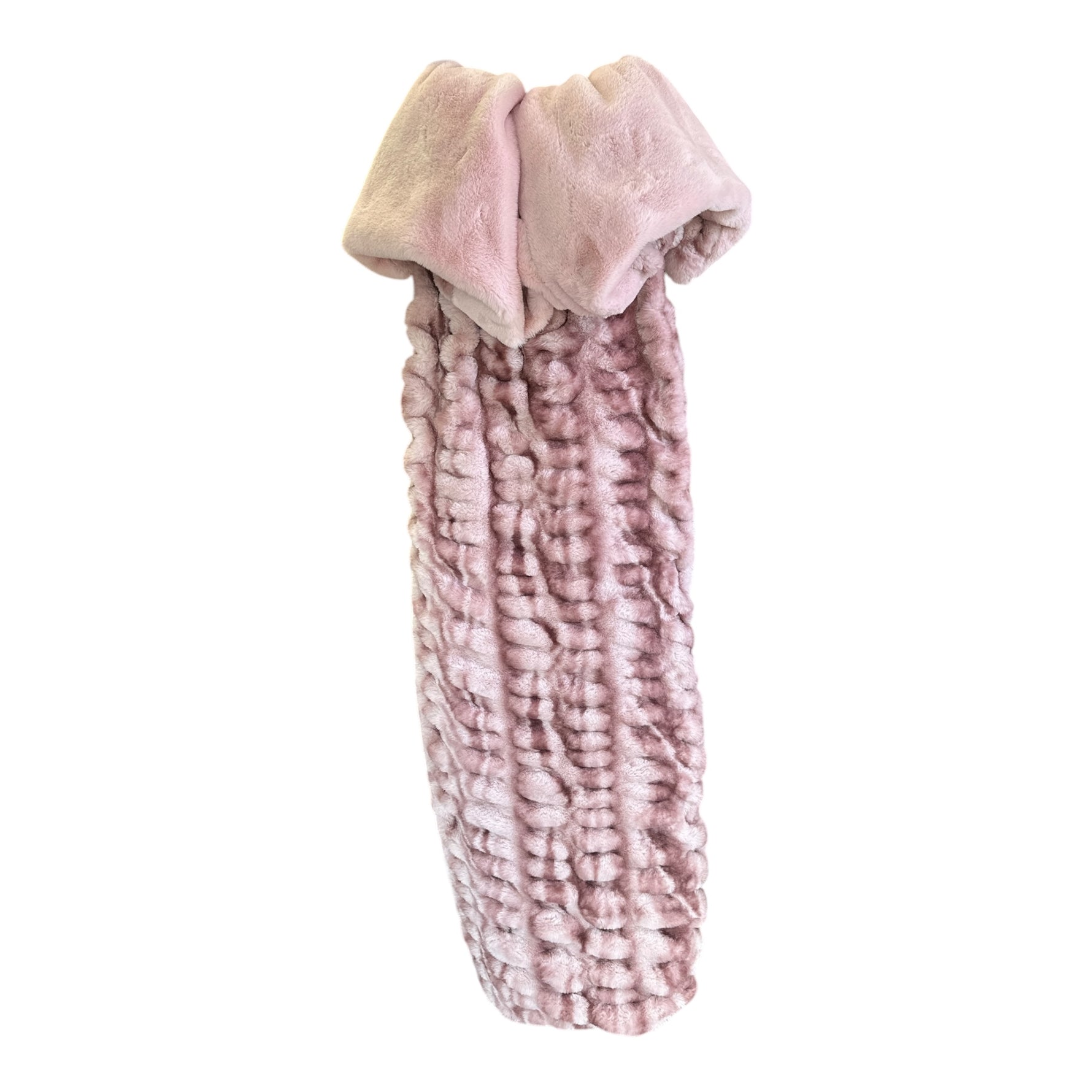Our beautiful new Luxe Milan in Bellini is beautiful with a unique abstract print. In addition to a luxuriously-high pile, it’s knitted with elastic so it’s extra stretchy and cascades into a rippling effect. Its backed with rosewater Encore minky fabric that takes this snuggle blanket to a new level of luxury.