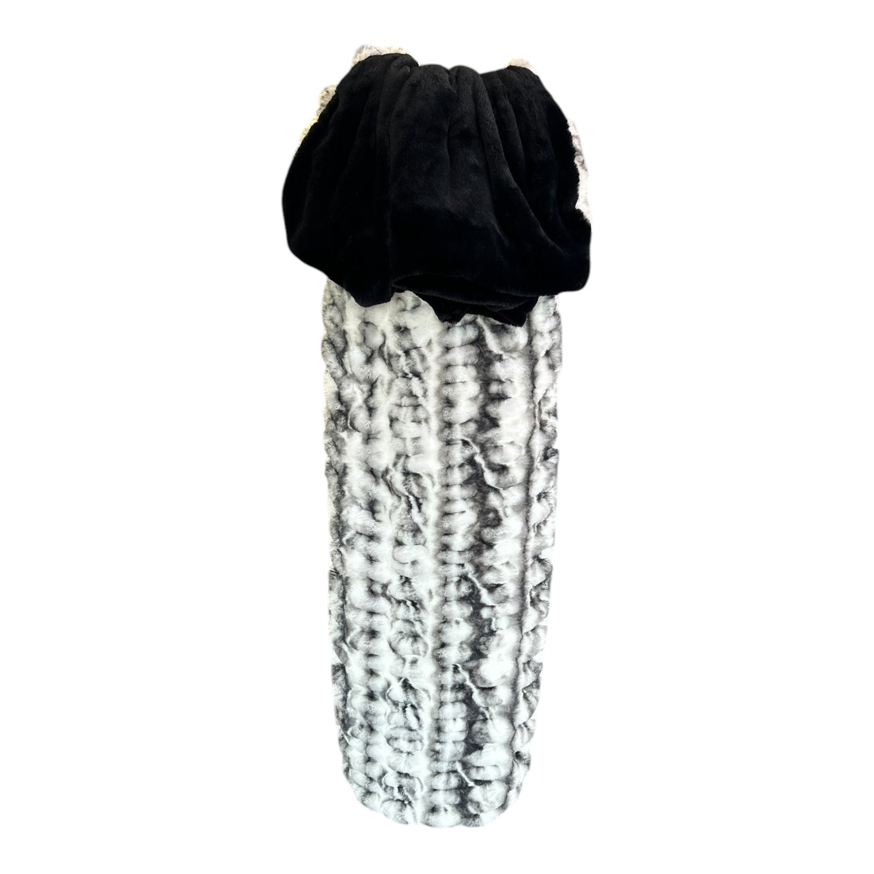 Our beautiful new Luxe Milan Enzo in Husky is beautiful with a unique abstract print. In addition to a luxuriously-high pile, it’s knitted with elastic so it’s extra stretchy and cascades into a rippling effect. Its backed with Encore minky in black that takes this snuggle blanket to a new level of luxury.