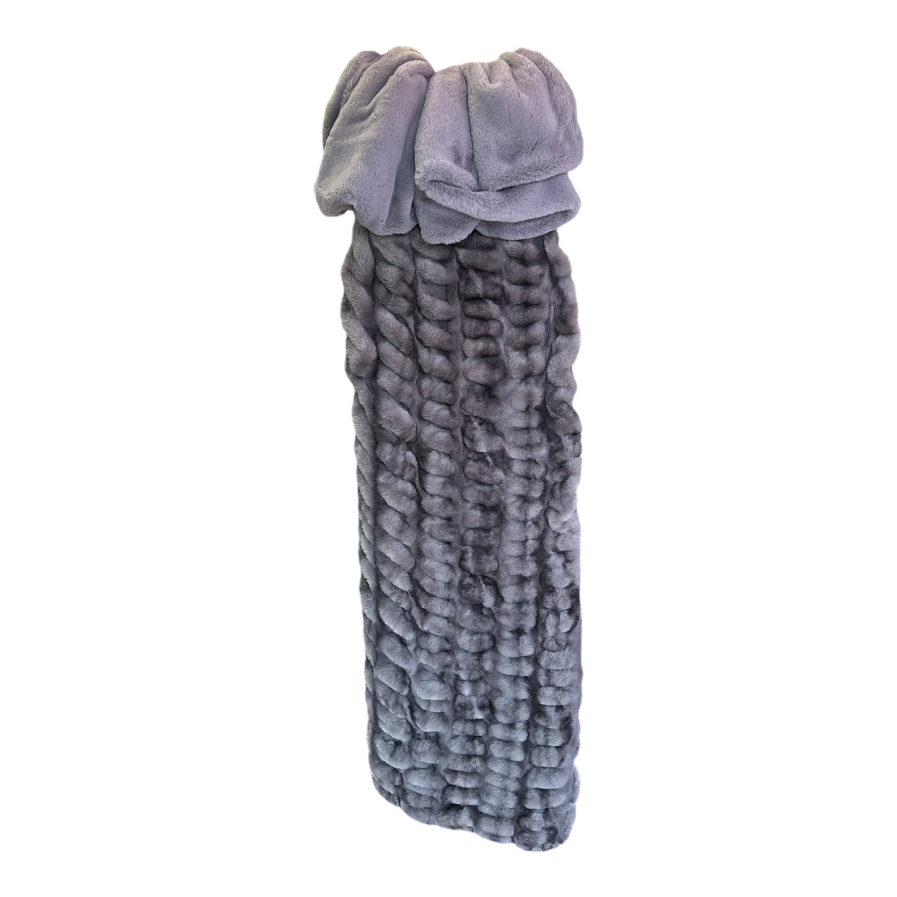 Our beautiful new Luxe Milan in graphite is beautiful with a unique abstract print. In addition to a luxuriously-high pile, it’s knitted with elastic so it’s extra stretchy and cascades into a rippling effect. Its backed with eith alloy or caviar seal minky that takes this snuggle blanket to a new level of luxury.
