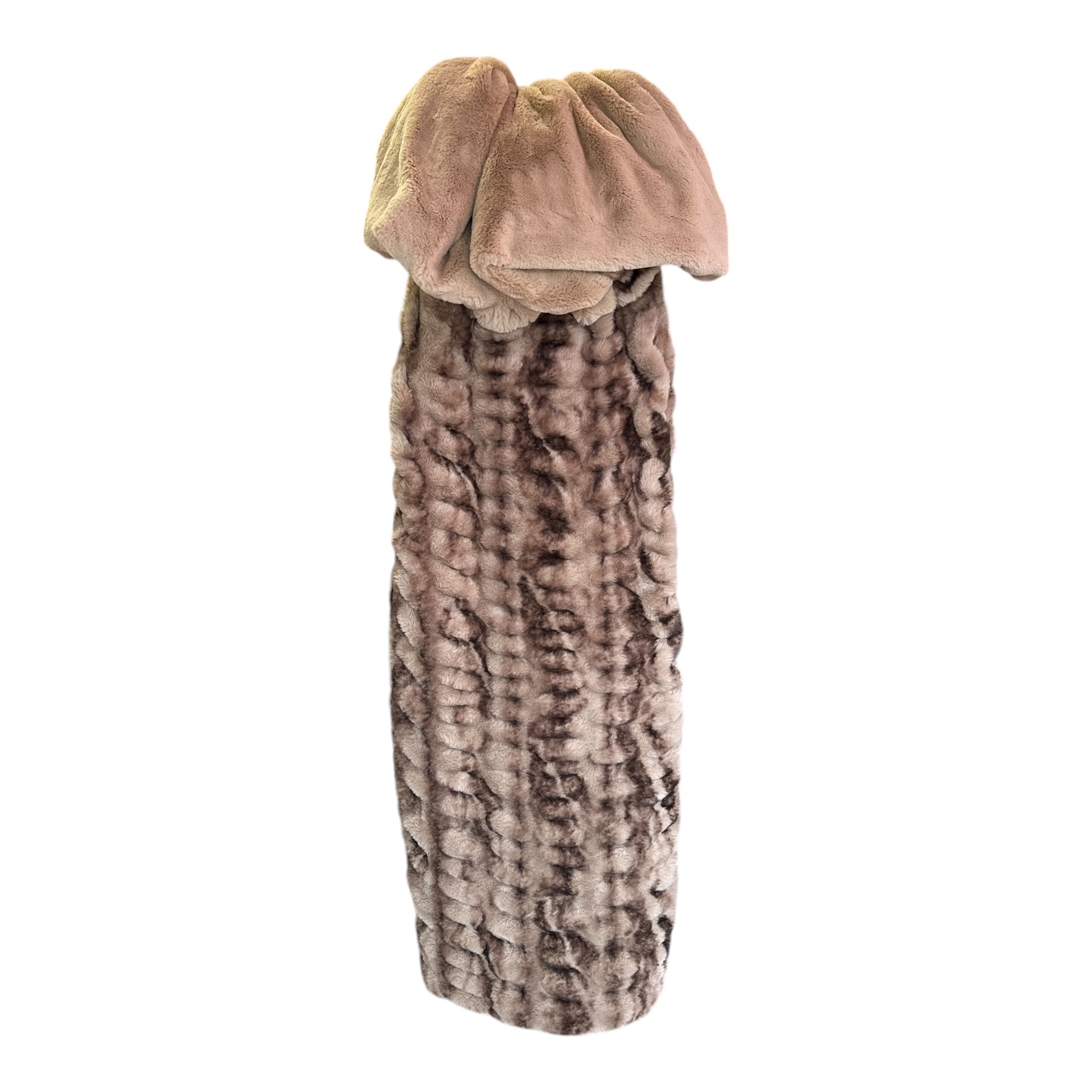 Our beautiful new Luxe Milan in mocha is beautiful with a unique abstract print. In addition to a luxuriously-high pile, it’s knitted with elastic so it’s extra stretchy and cascades into a rippling effect. Its backed with either truffle or sand seal minky that takes this snuggle blanket to a new level of luxury.