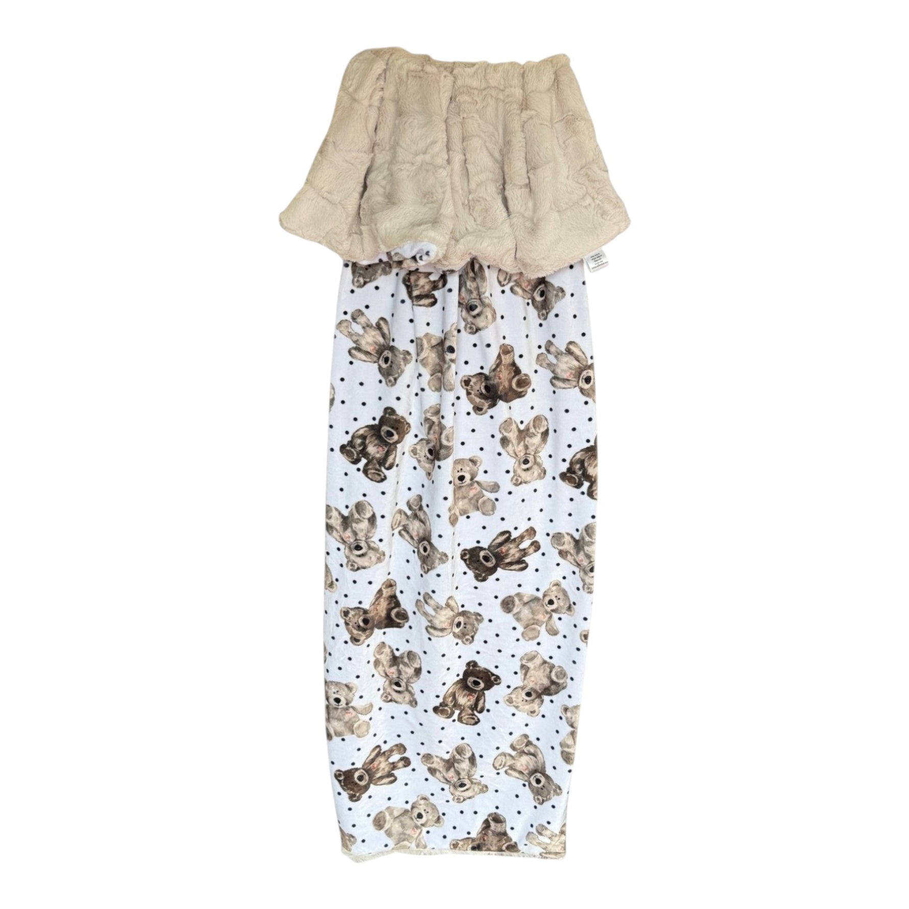 This blanket features the Cuddly Teddy Dreams Minky print, filled with adorable teddy bears in soft neutral tones scattered across a delicate polka dot background. The calming design creates a soothing and comforting look perfect for nurseries, nap time, and quiet moments.