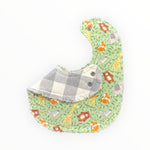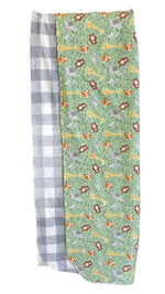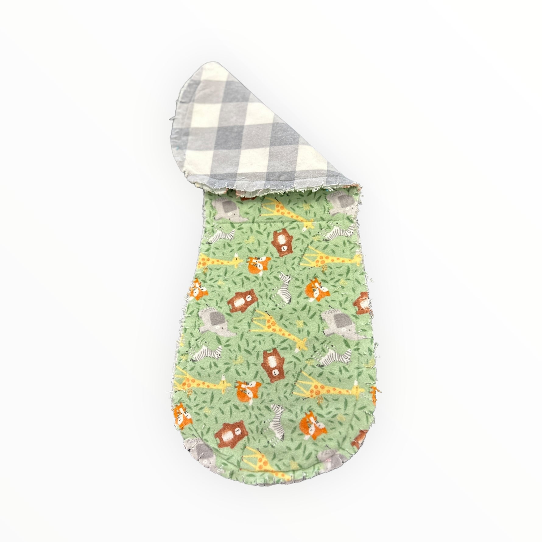 Baby zoo animals adorn this green flannel fabric with a fun gray and white check flipside