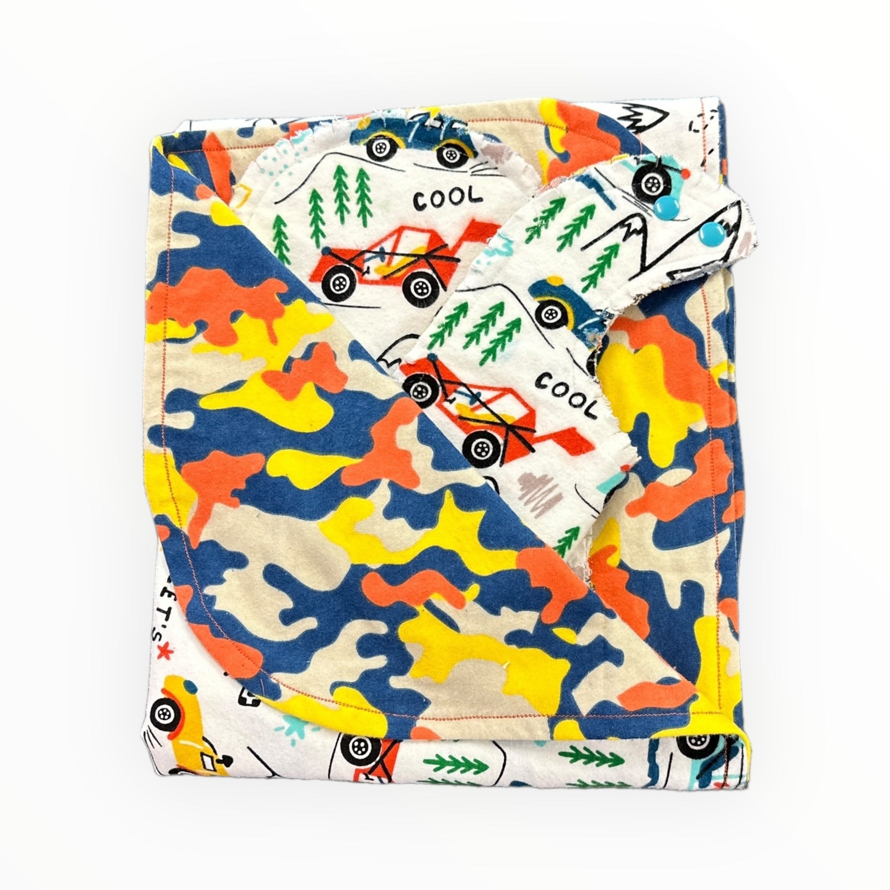 These colorful cars seem to be racing thru the mountains on this white flannel with a color camo flannel to match on the flip side
