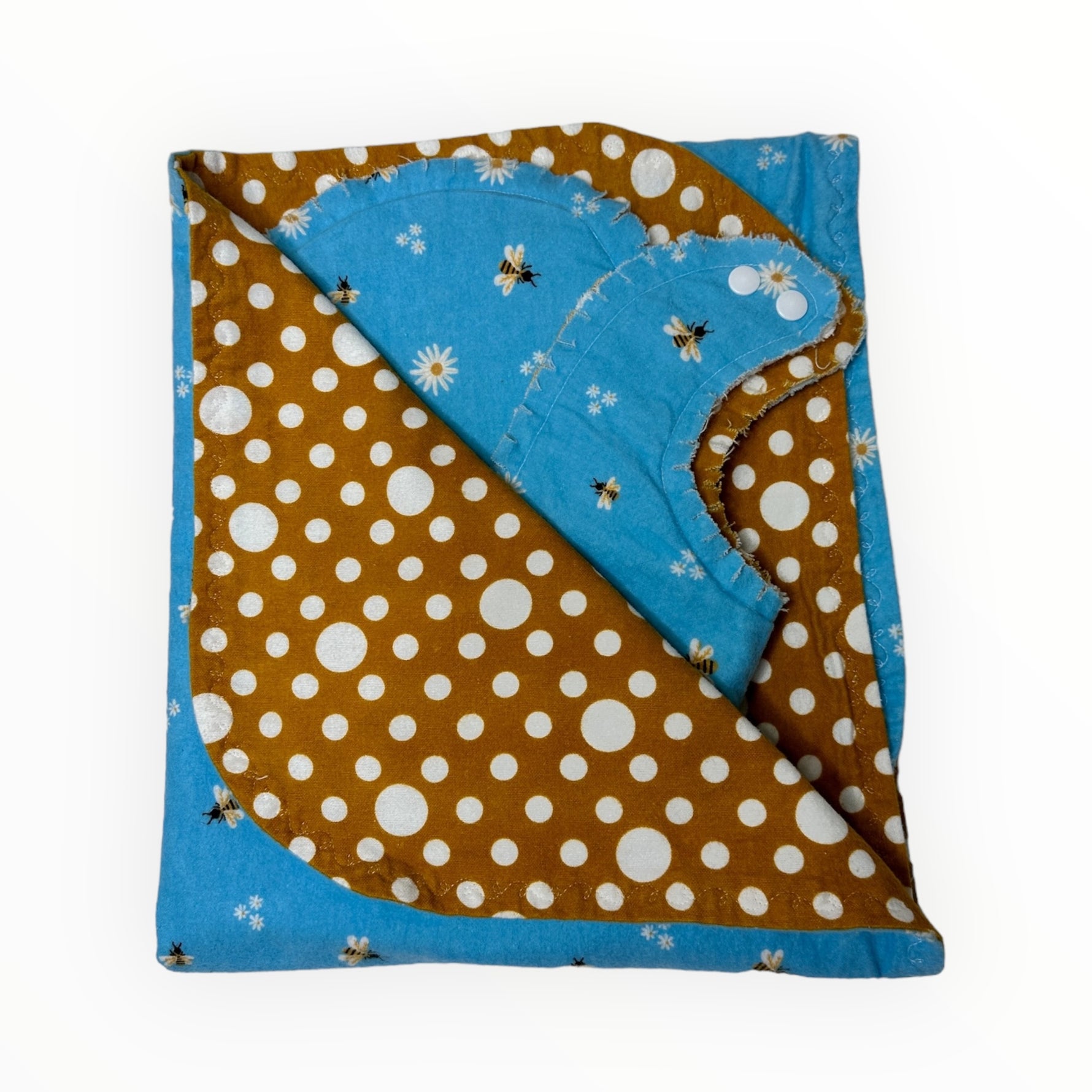 Bee and daisies on a pretty blue background with a polka dot terra cotta flipside