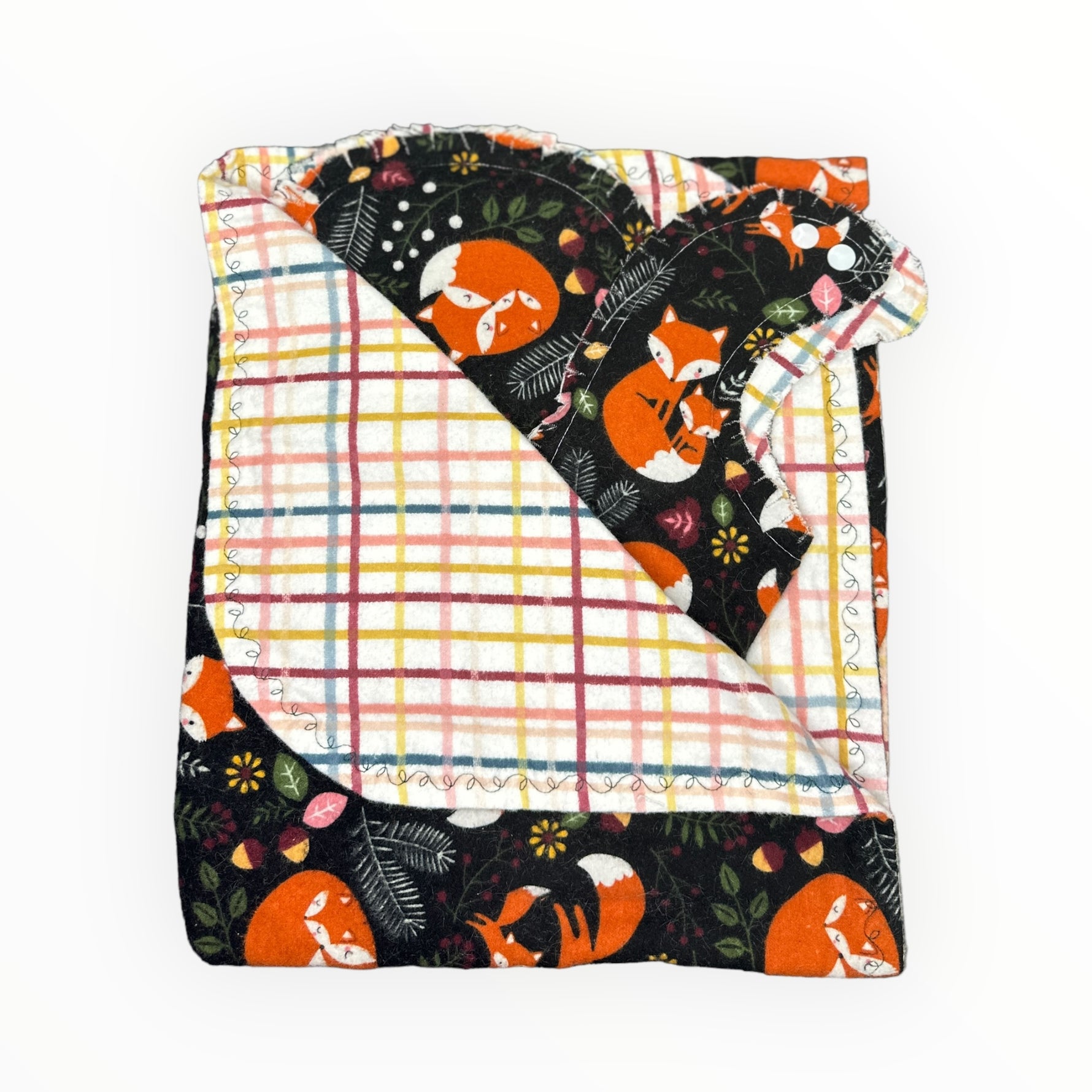 Playful foxes on a black background with a plaid flip side