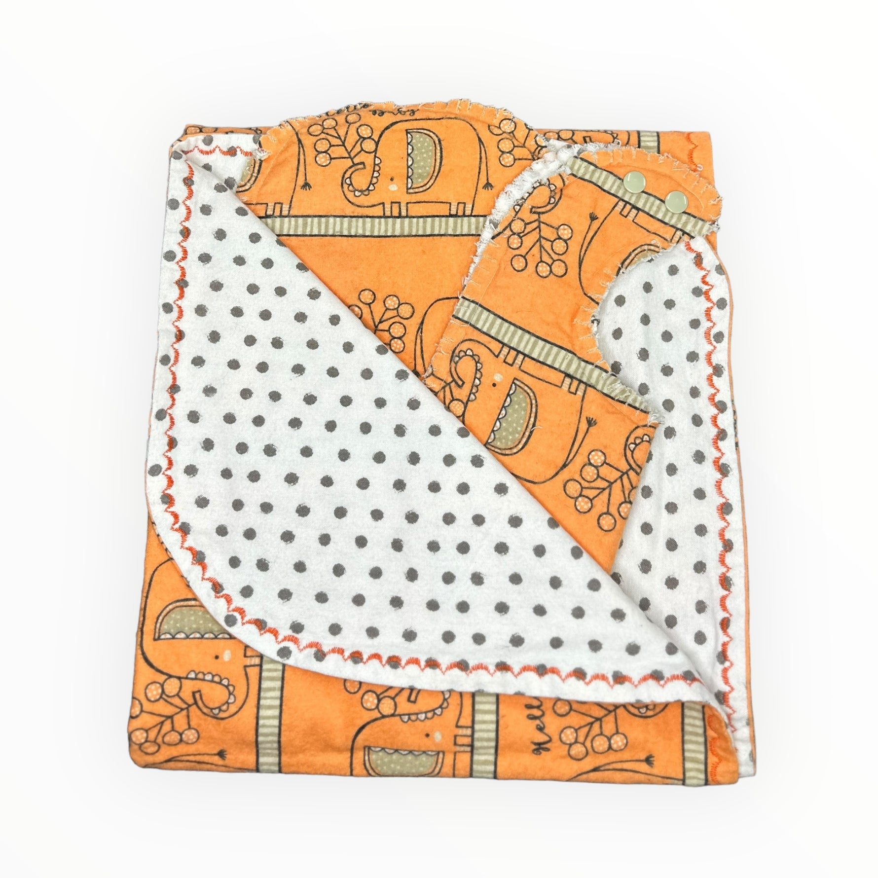 Pale orange flannel fabric with greetings from elephants"hello baby" with a gray polka dot back