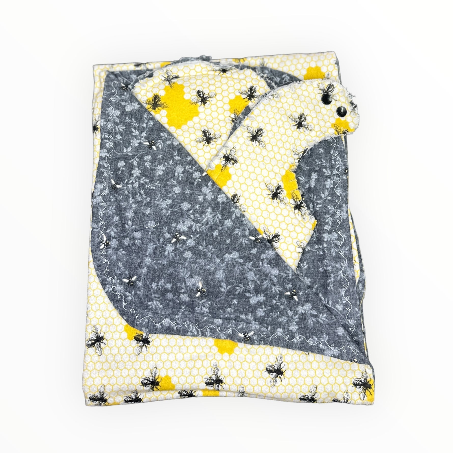 Honey bees on a yellow honeycomb background with the flip side being black with bees.