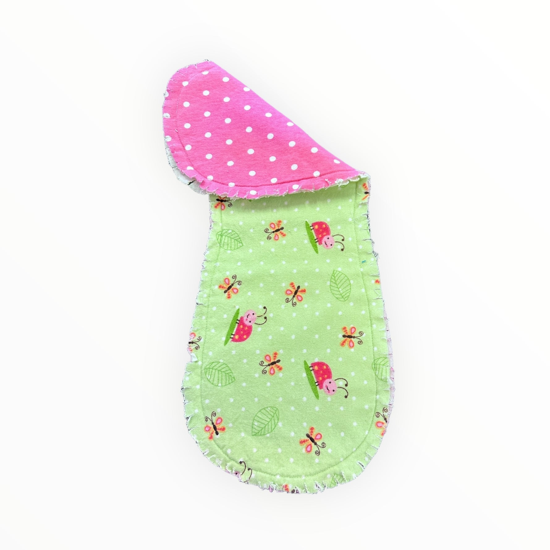 Bright pink ladybugs adorn this lime green flannel with a bright pink and white polka dot flipside