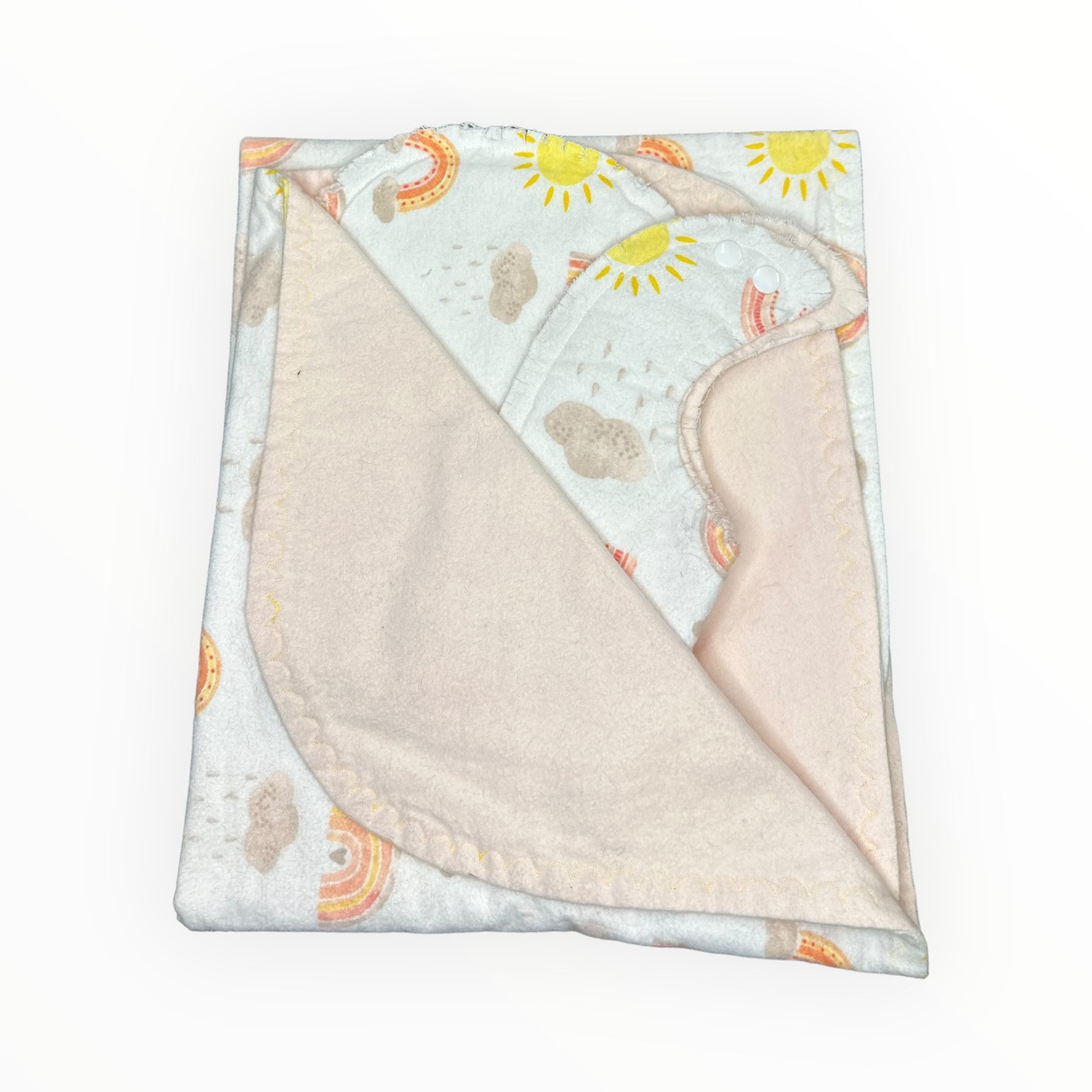 Rain Clouds with rainbows and sunshine re on this flannel with the palest peach flip side