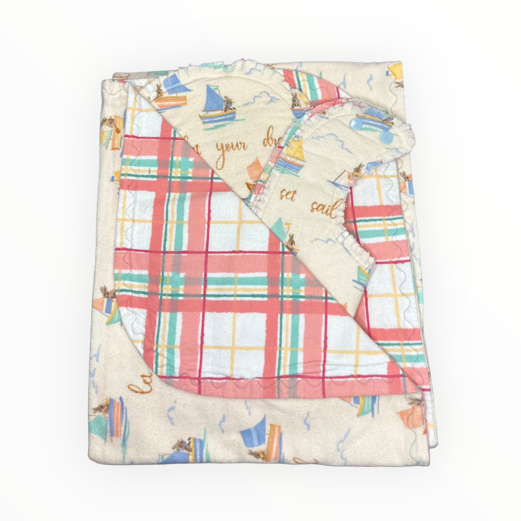 Sweet little sailboats with captain bunny are on this flannel with the flip side being a peach and green check flip side