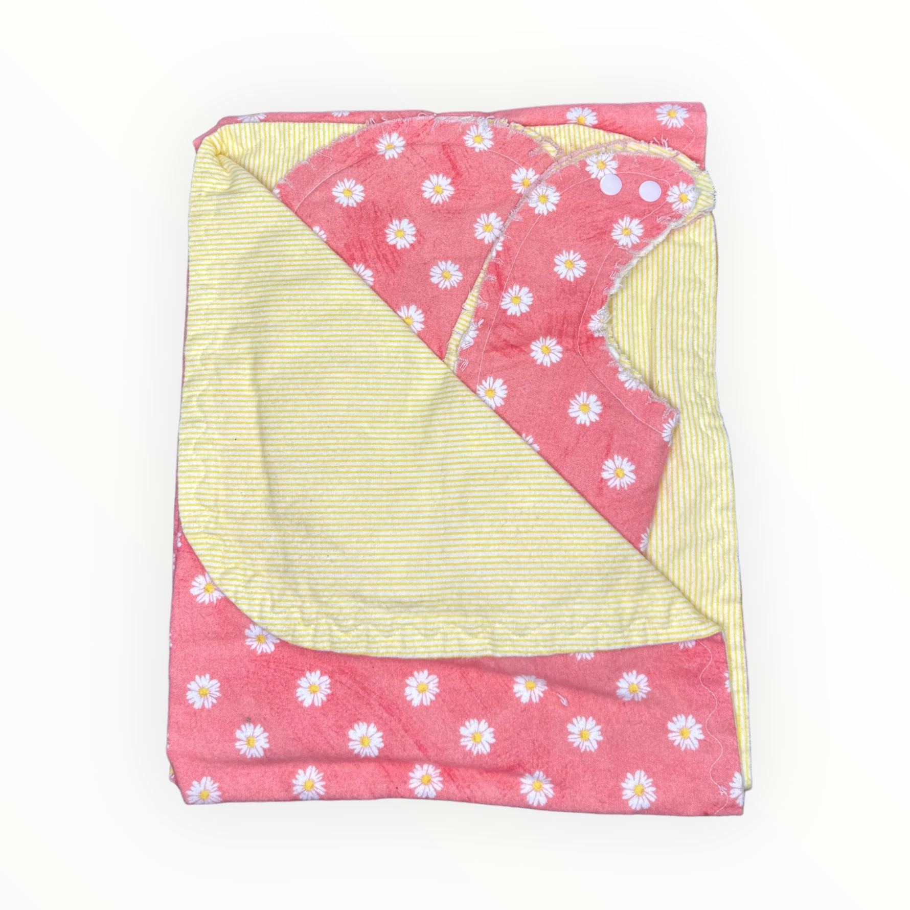 Sweet little daisys on a coral background with a pale yellow pinstripe flip side