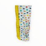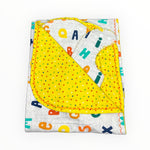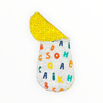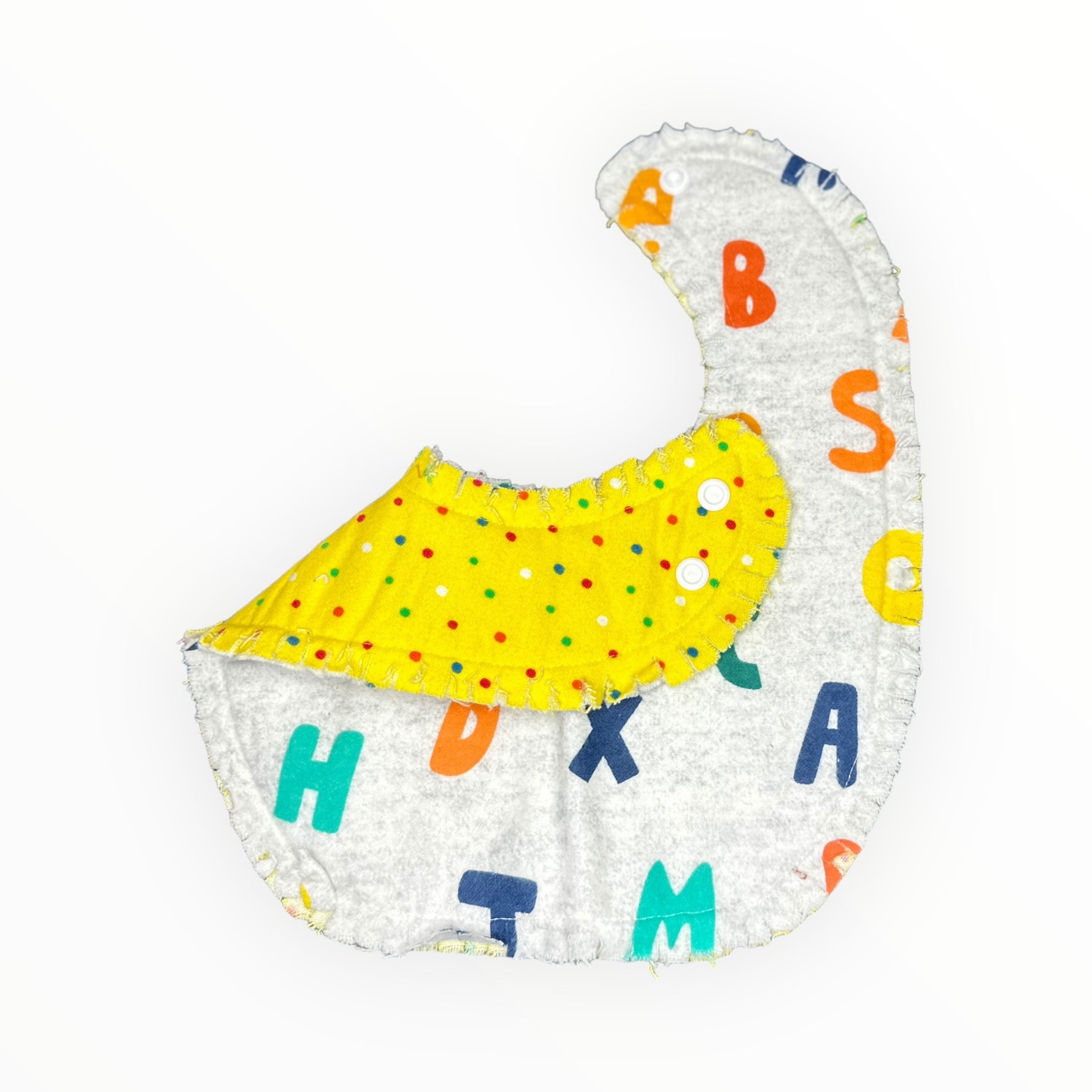 Gray flannel fabric with bright alphabet letters are on the front with a bright yellow multi colored polka dots on the back