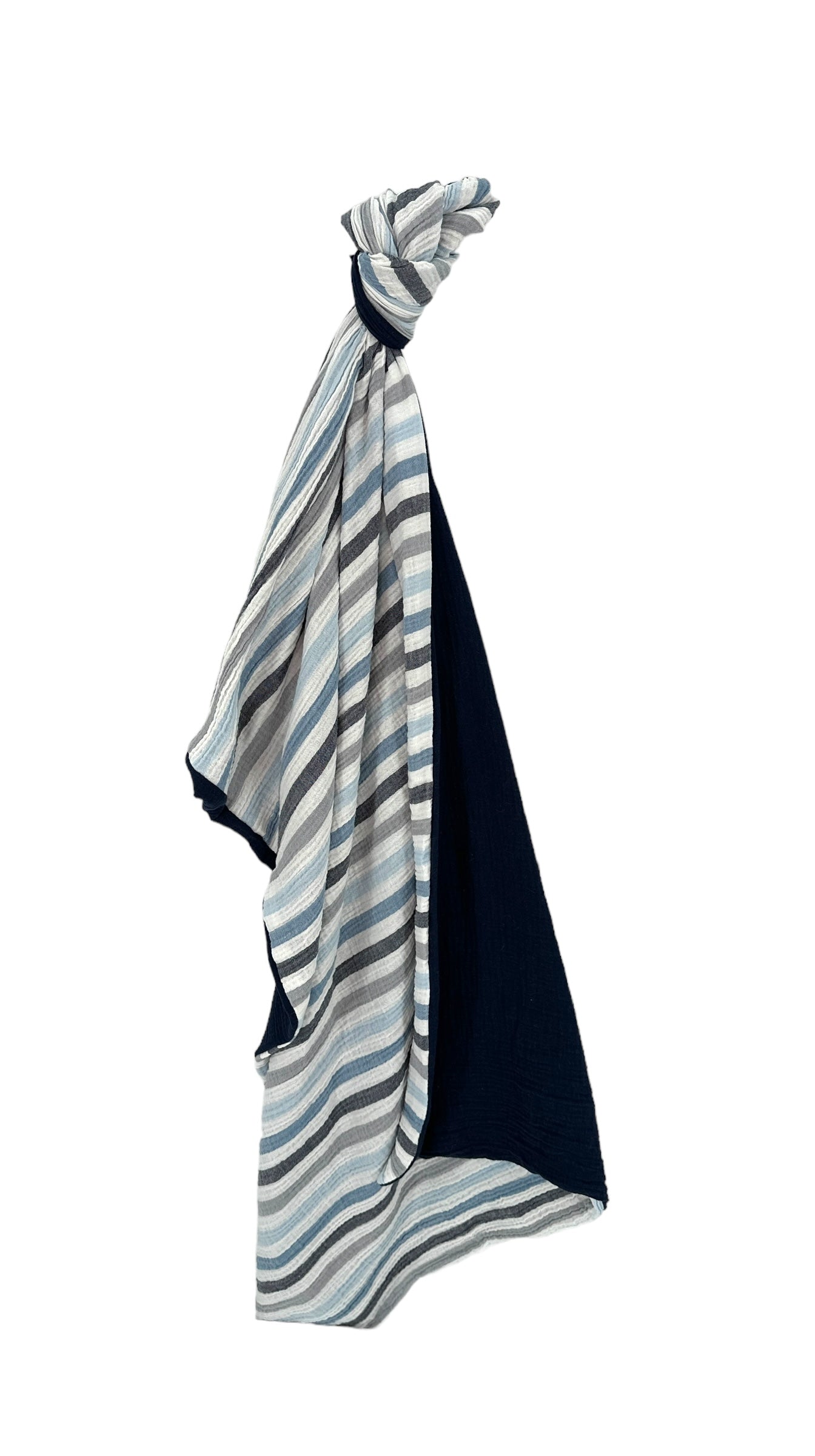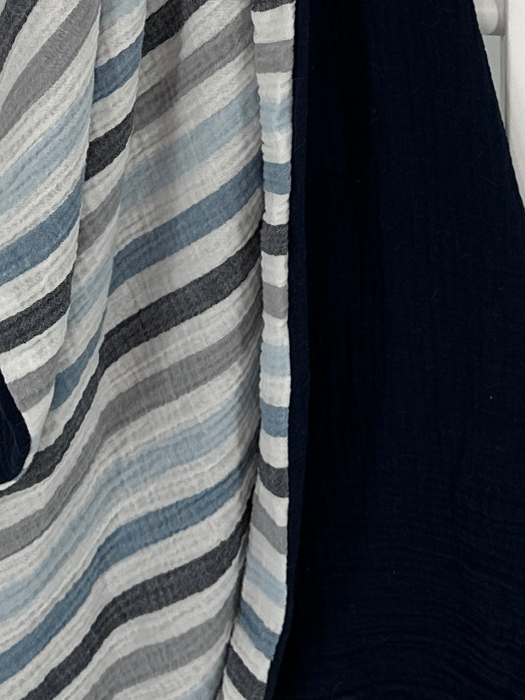 Blue and gray stripes are on this gauze fabric with a navy gauze backside