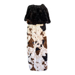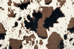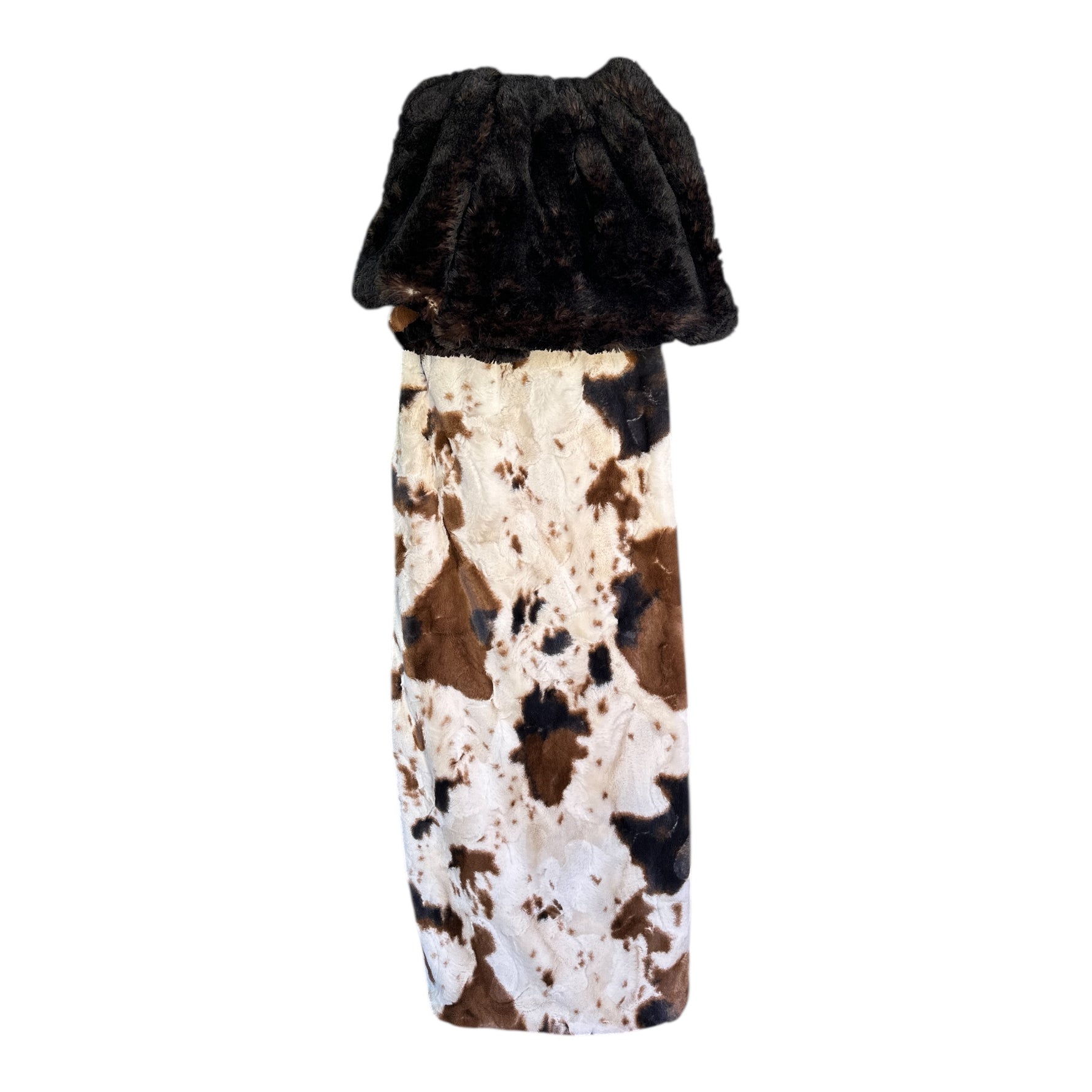 Embrace the cozy warmth of the countryside with our cow print snuggle blanket made from our signature soft Minky fabric. This unique blanket features, a playful cow pattern in browns and black on one side and the luxurious arctic rabbit minky fabric in black, perfect for adding rustic charm to your snuggle time.