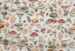 Mushrooms of all shapes in earth tones are on this cloud minky fabric with your choice of ginger or spruce fluffy hide minky backside