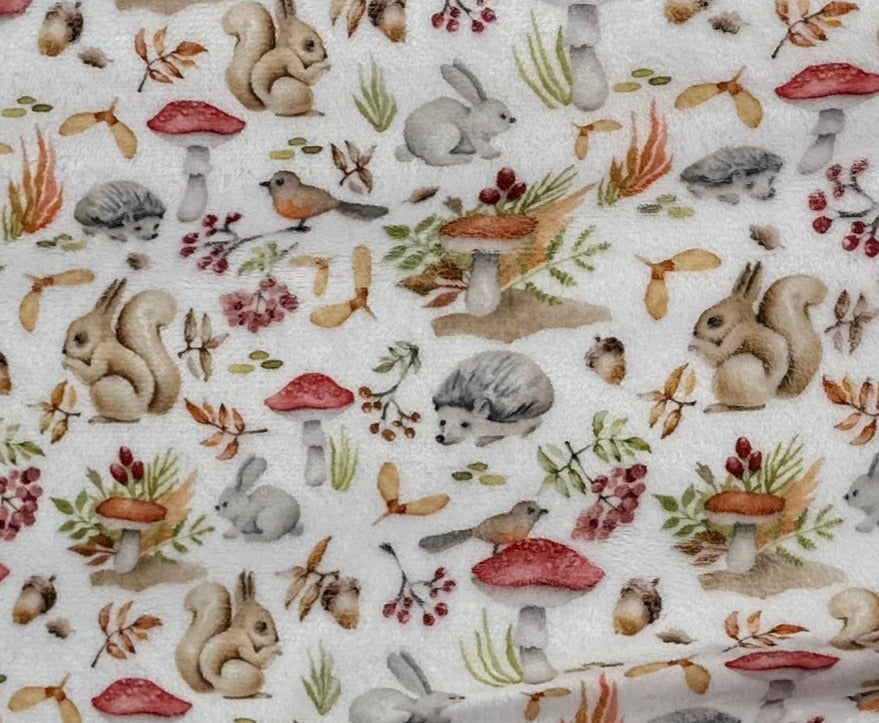 This adorable minky is all things forest with mushrooms and critters on this cloud minky fabric with your choice of flipside being safari, ginger or graphite hide minky fabric.